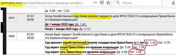 - вариант “Суд вернет весь Приватбанк его бывшим владельцам“ “ДА“ имеет коэффициент 3,50, “НЕТ“ - 1,28.