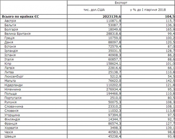В первом полугодии 2019 года экспорт украинских товаров в Евросоюз составил 10 миллиардов 284 миллионов 296,9 тысяч долларов. Рост экспорта относительно первого полугодия прошлого года составил 5%. Соответствующие данные опубликовала Государственная служба статистики во вторник, 20 августа.