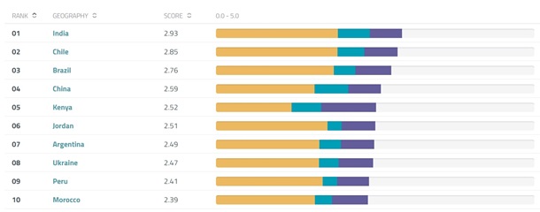 Рейтинг возглавили крупнейшие развивающиеся экономики: Индия, Бразилия, Китай, Аргентина. К ним присоединились Чили, Иордания и Кения. Для сравнения, Россия находится на 66 месте.