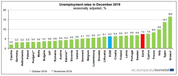 Самые высокие показатели безработицы наблюдались в Греции (16,6% в октябре 2019), Испании (13,7%) и Италии (9,8%).
