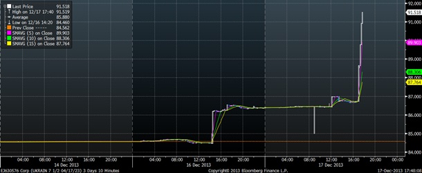 Котировки украинских гособлигаций с погашением в 2023 году повысились на 5,9% пункта до 91,49% от номинала (по состоянию на 19.40 мск). Доходность суверенных евробондов с погашением в 2014 году в течение часа после заявлений президента России о выделении Украине кредита в $15 млрд снизилась в 1,8 раза. По данным агентства Bloomberg, она составила 7,93% годовых, тогда как еще по состоянию на 17.00 по Киеву равнялась 14,33% годовых.