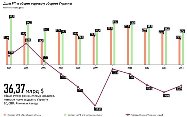 На Россию приходится примерно четверть всего украинского экспорта. В основном это промышленная продукция, такая как железнодорожные вагоны и изделия ВПК. Москва проявляет готовность запретить ввоз украинской продукции по техническим причинам на фоне напряженности отношений между двумя странами, как это уже было с конфетами марки Roshen, производимыми "шоколадной империей" самого Порошенко. Не исключено, что Россия может повысить импортные тарифы для украинских товаров.