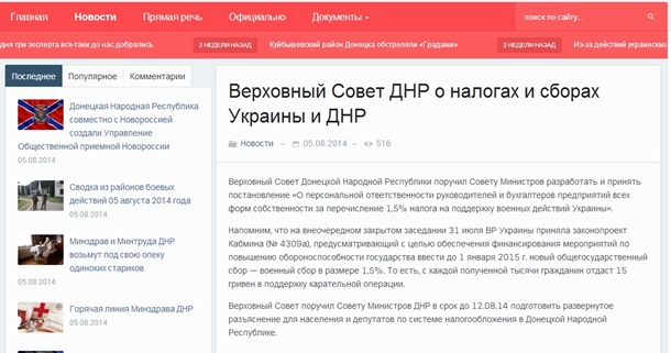 Согласно сообщению пресс-центра ДНР, "Верховный совет республики" поручил разработать и принять постановление О персональной ответственности руководителей и бухгалтеров предприятий всех форм собственности за перечисление 1,5% налога на поддержку военных действий Украины. "Верховный Совет поручил Совету Министров ДНР в срок до 12.08.14 подготовить развернутое разъяснение для населения и депутатов по системе налогообложения в Донецкой Народной Республике", - сказано в сообщении.
