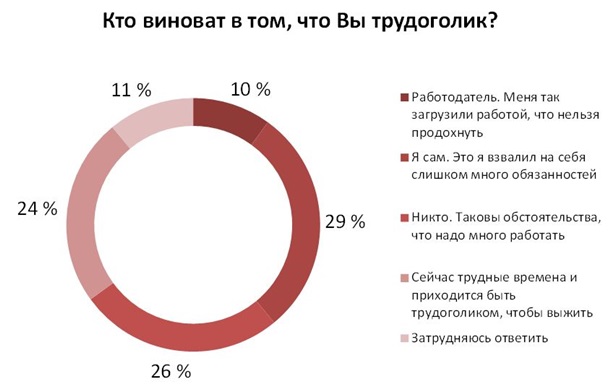 В 2012 году любители труда считали свой объем работы нормальным из-за массовых сокращений и перераспределения обязанностей. На данный момент 29% сотрудников отметили, что они сами взвалили на себя много обязанностей (против 39% в 2012 г.), а у 26% трудоголизм вызван внешними обстоятельствами. При этом для 24% это вынужденная мера для выживания в трудные времена, и только 10% винят в загрузке работой начальство, хотя в 2012 г. этот показатель был в два раза больше.