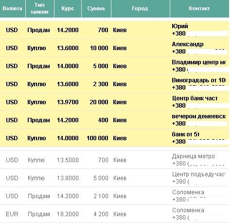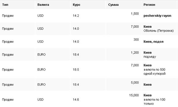 Продают, в основном, доллары, и по неофициальному курсу – не менее 14 гривен за доллар. Евро предлагают купить по 18 гривен. Подобные предложения можно найти по любому городу Украины, а объемы торгов достигают миллионов гривен.