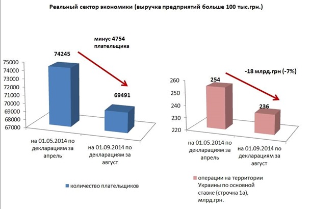 С мая по сентябрь 2014 года количество предприятий в реальном секторе экономики сократилось почти на пять тысяч, а объем их операций на территории Украины уменьшился на 18 миллиардов гривен. Об этом на своей странице в сети Facebook написал экс-министр доходов и сборов Украины Александр Клименко.