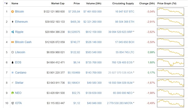 Курс биткоина сегодня опускался ниже очередной психологической отметки. За последние сутки он опять упал и сейчас торгуется на отметке в $7205. Все остальные криптовалюты торгуются в основном в красной зоне.