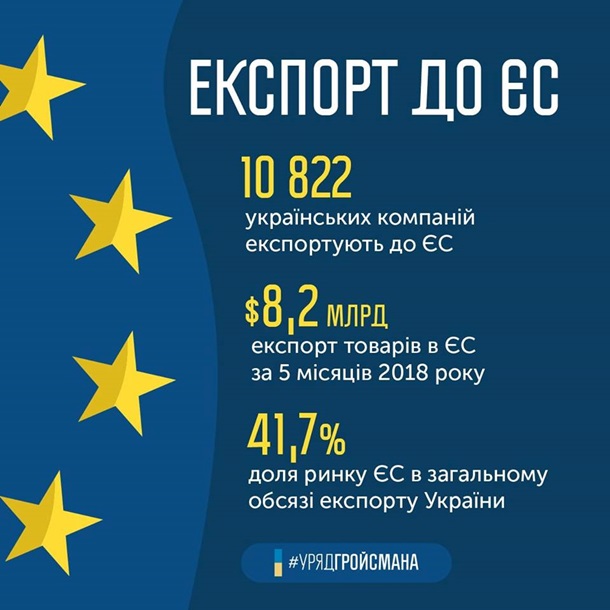 "Евросоюз - рынок номер один для украинского экспорта. Мы уверенно наращиваем объем взаимной торговли. Уже более 10 тысяч украинских компаний работают на европейском рынке", - отметил Гройсман.