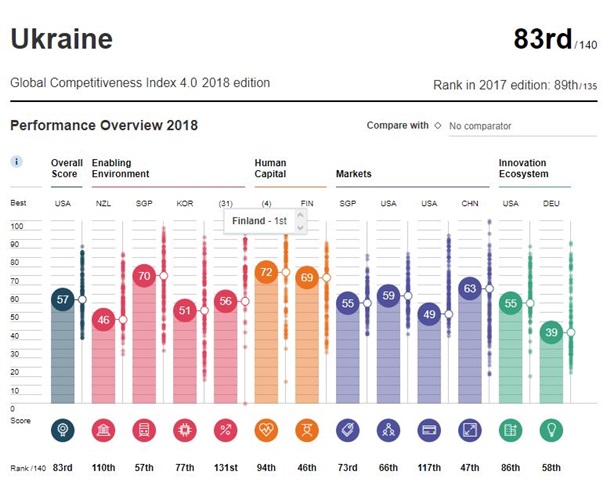 Согласно рейтингу, по уровню государственных институтов Украина занимает 110 месте, по инфраструктуре находится на 57 месте, по уровню адаптация технологий - на 77 месте.