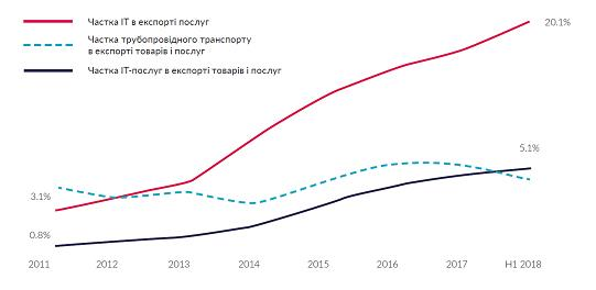 Также стремительно растет значимость IT-услуг в структуре украинского экспорта. Так, в 2017 году компьютерные услуги заняли 3-е место среди экспорта услуг из Украины, а по результатам первого полугодия 2018 года обогнали трубопроводный транспорт и стали второй крупнейшей отраслью по экспорту услуг - более 20% всех экспортируемых услуг.