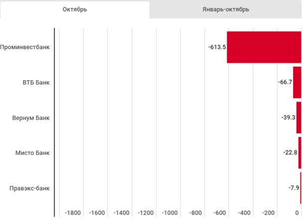 В то же время наиболее убыточными за указанный период были банки с российским капиталом: Проминвестбанк потерял 613,5 млн гривен, а ВТБ Банк - 66,7 млн гривен.