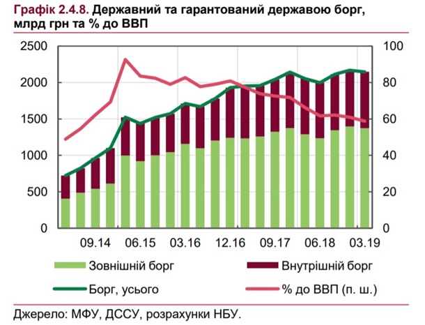 "Несмотря на такие привлечения, государственный и гарантированный государством долг в целом уменьшился на 1,0% с начала года – до 2,147 млрд грн по состоянию на конец марта 2019 года. Это обусловлено выплатами по гарантированному долгу, в частности перед МВФ. Дополнительным фактором было незначительное укрепление гривны", – говорится в обзоре.