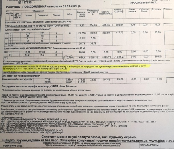 Соответственно, начисление за услугу составило: в ноябре 2019 967,17 гривен (0,5846 Гкал х 1654,41 грн/Гкал), а в декабре 2019 1305,33 гривен (0,789 Гкал х 1654,41 грн/Гкал).