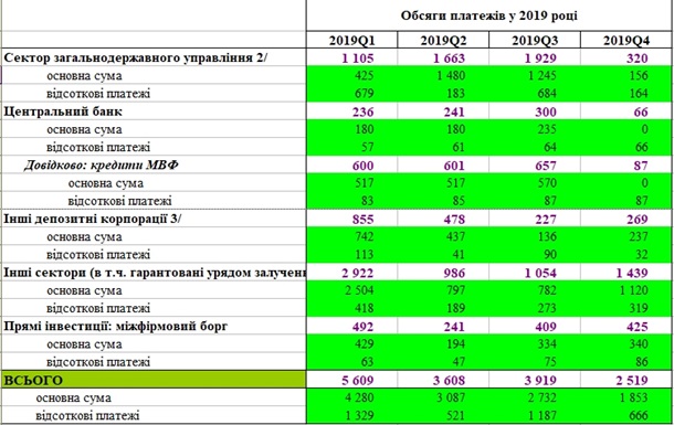 Правительство Украины должно погасить за год 5,016 млрд долларов долгов, центробанк - 842 млн долларов. В том числе в пользу МВФ нужно заплатить 1,945 млрд долларов.