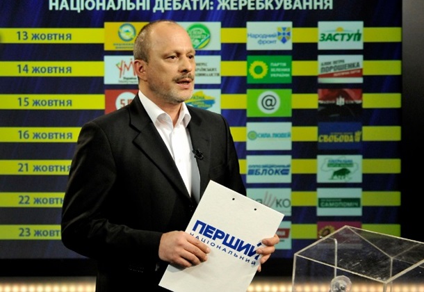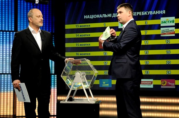 На Первом Национальном телеканале прошла жеребьевка среди представителей политических партий, участвующих во внеочередных выборах в Верховную Раду Украины 26 октября 2014 года, для проведения теледебатов.