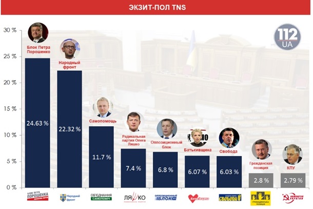 Согласно данным экзит-полла TNS, выборы в Верховную Раду выиграла партия Блок Петра Порошенко, за которую проголосовали 24,63% избирателей. Остальные партии, которые проходят в состав нового парламента, расположились в следующем порядке: "Народный фронт" – 22,32% "Самопомощь" – 11,70%, Радикальная партия Олега Ляшко – 7,40%, "Оппозиционный блок" – 6,80%, ВО "Батькивщина" – 6,07% и ВО "Свобода" – 6,03%.