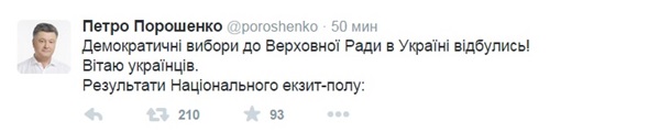 Президент Украины Петр Порошенко поздравил соотечественников с тем, что состоялись демократичные парламентские выборы. "Демократичные выборы в Верховную Раду Украины состоялись! Поздравляю украинцев", – написал глава государства в своем Twitter в воскресенье, 26 октября.